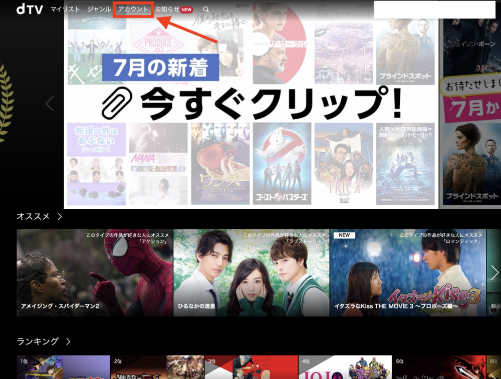 手順1:「dTV」にアクセスし、上にあるアカウントをクリック