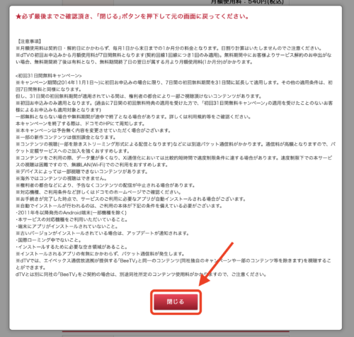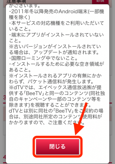 docomoのホームページに移動するので、下の方にある「dTVの注意事項」をクリックして、注意事項を確認し、「閉じる」をクリックします。