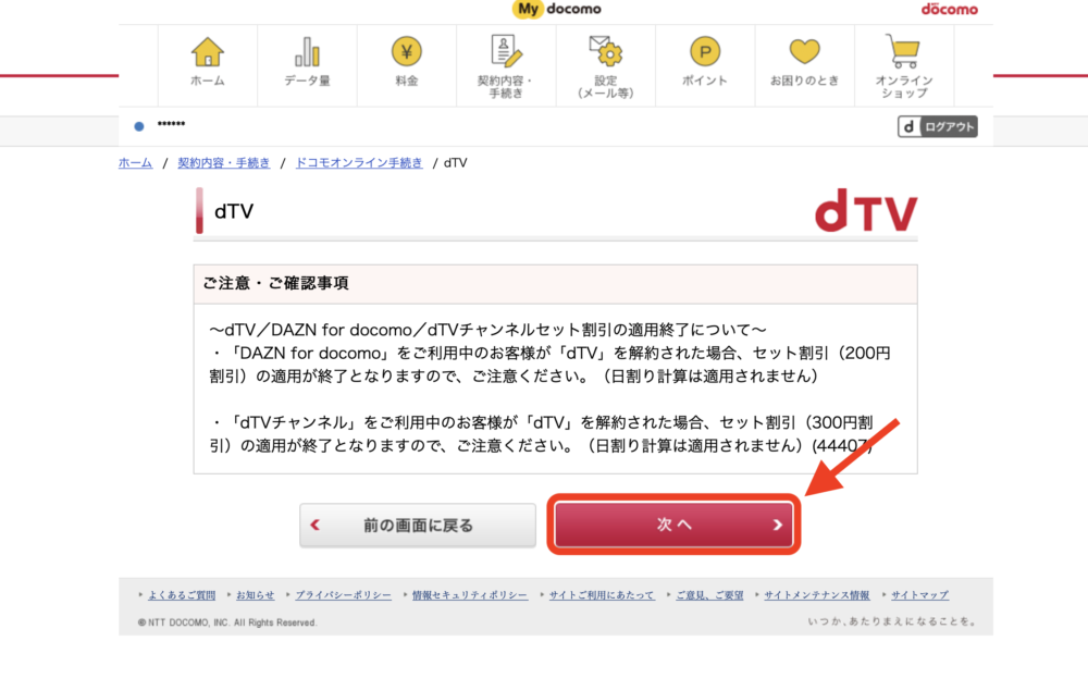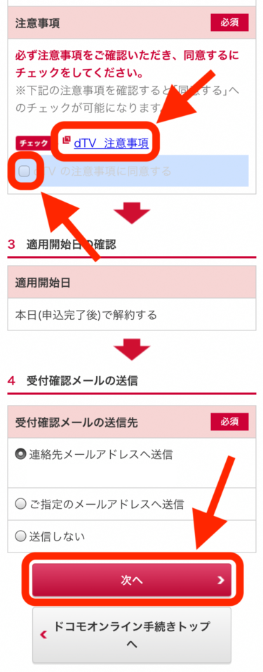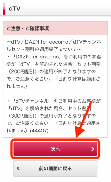 その後、「dTVの注意事項に同意する」にチェックを入れて、「次へ」をクリックします。