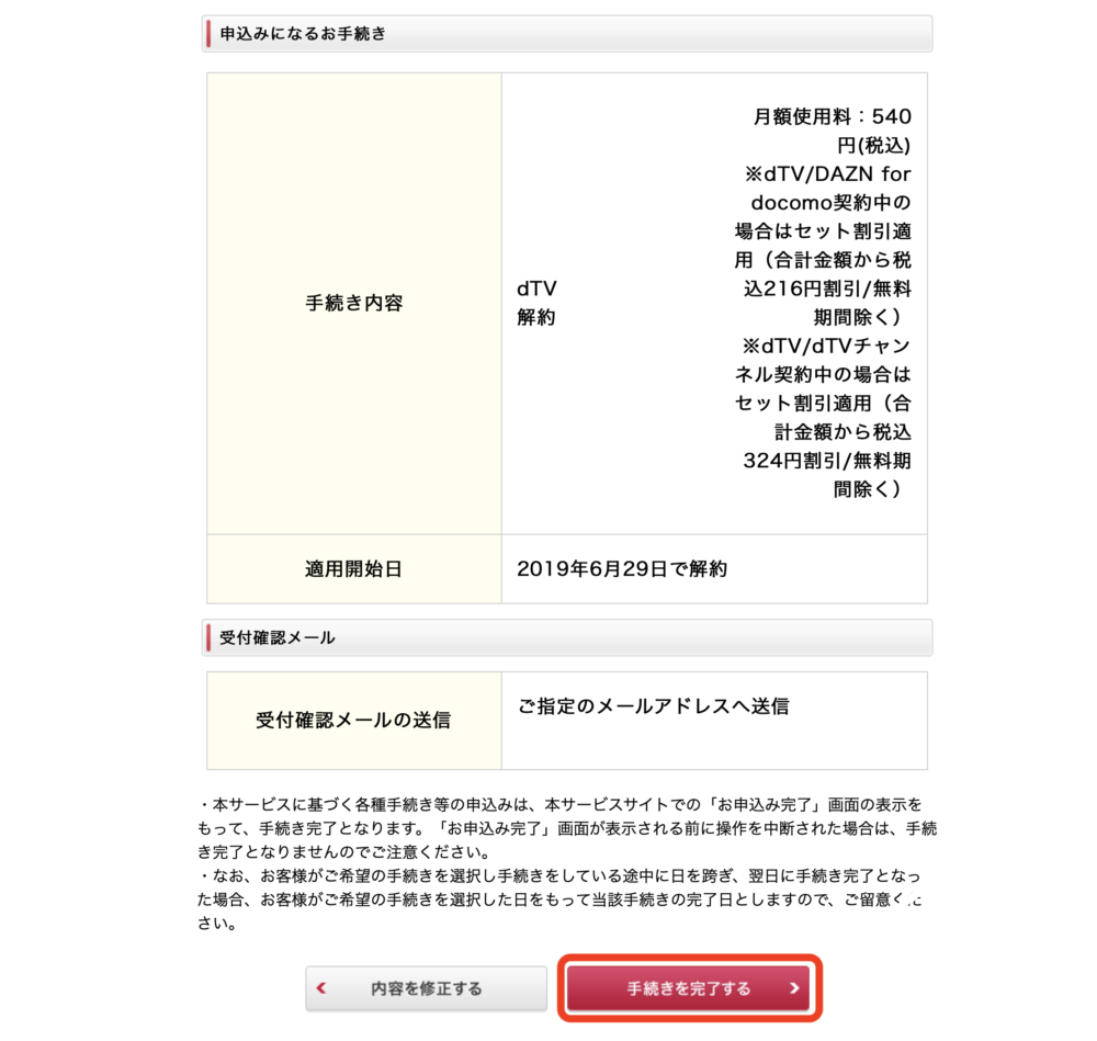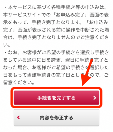 手続き内容確認画面になるので、内容を確認したら下にある「手続きを完了する」をクリックします。