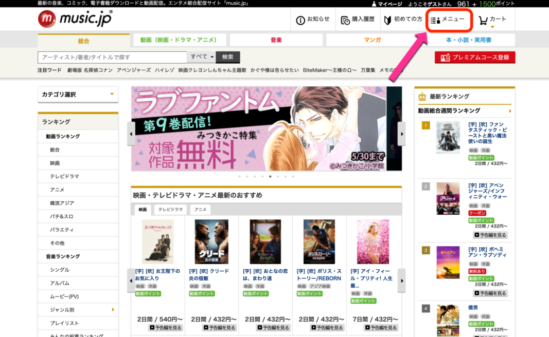 手順1:「music.jp」にアクセスし、メニューをクリック
