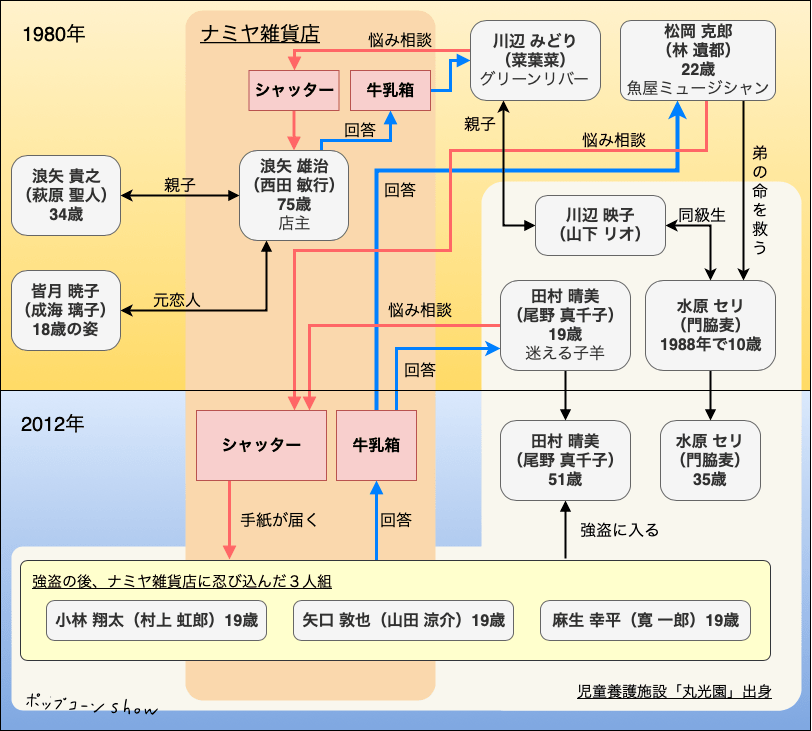 そんな映画「ナミヤ雑貨店の奇蹟」ですが、舞台となる1980年と2012年の場面転換が多いため、登場人物の関係性がわかりにくいという声が多く聞こえます。